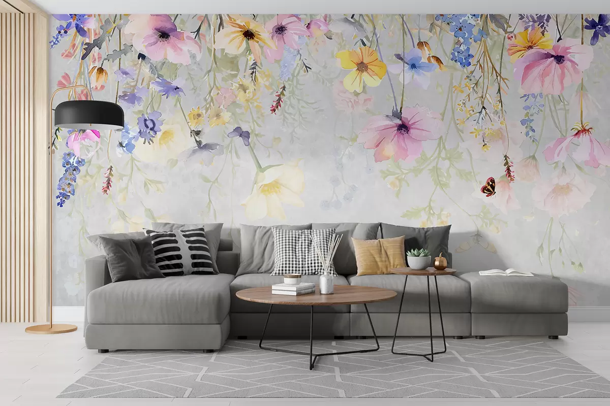 Fototapety Farebné kvety s ružovými, žltými a modrými kvetmi visiacimi z hornej časti na textúrovanom sivom pozadí Nr. w08309