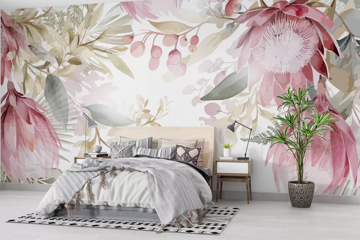 Fototapety Veľké ružové a biele priehľadné protey so sviežimi zelenými listami na svetlom pozadí Nr. w08315