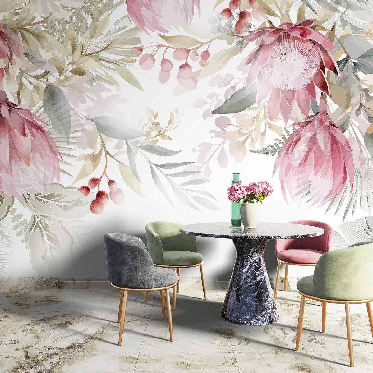 Fototapety Veľké ružové a biele priehľadné protey so sviežimi zelenými listami na svetlom pozadí Nr. w08315