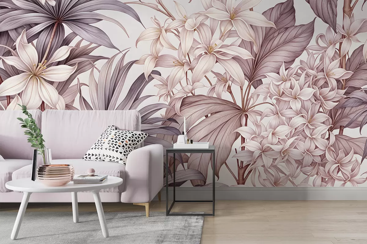 Fototapety Tropická kvetinová potlač s veľkými bielymi a svetloružovými kvetmi, bordovými listami a neutrálnym pozadím Nr. w08318v1