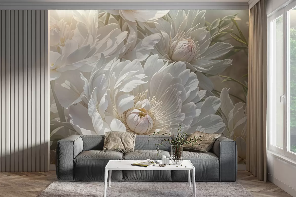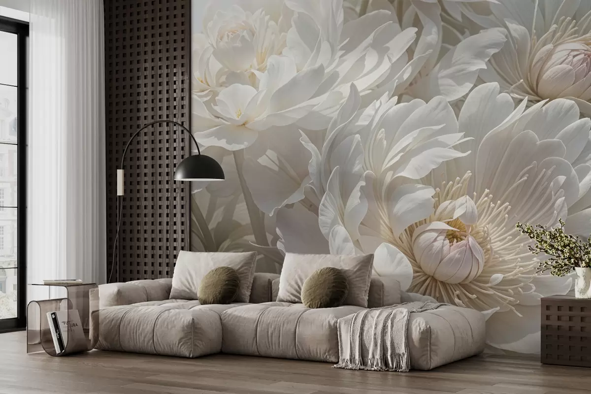 Fototapety Detailný záber na veľké, jemné biele kvety pivónie s mäkkými, nadýchanými okvetnými lístkami a bledožltými stredmi Nr. w08325