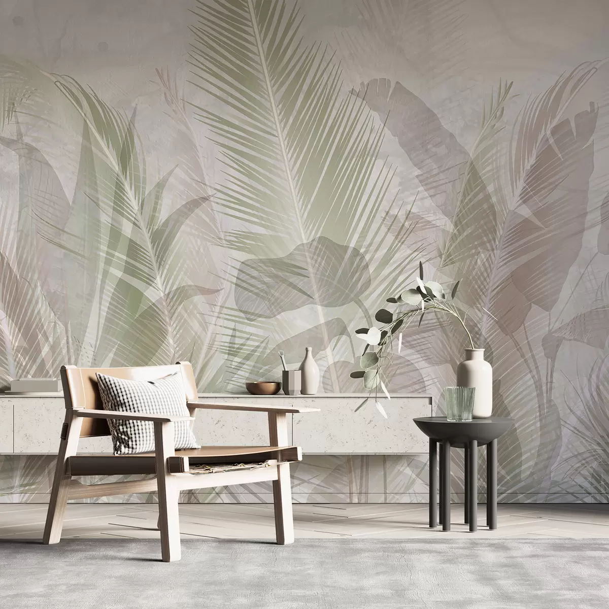 Fototapety Tropické palmové listy v jemných pastelových farbách s rozmazaným a hmlistým textúrovaným pozadím Nr. w08326