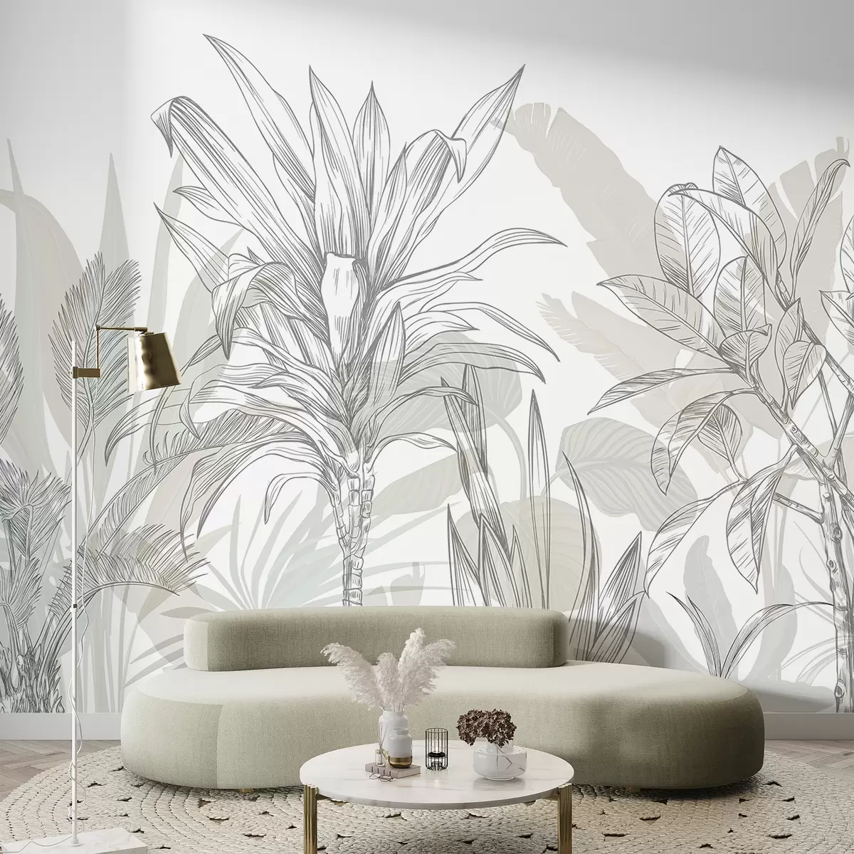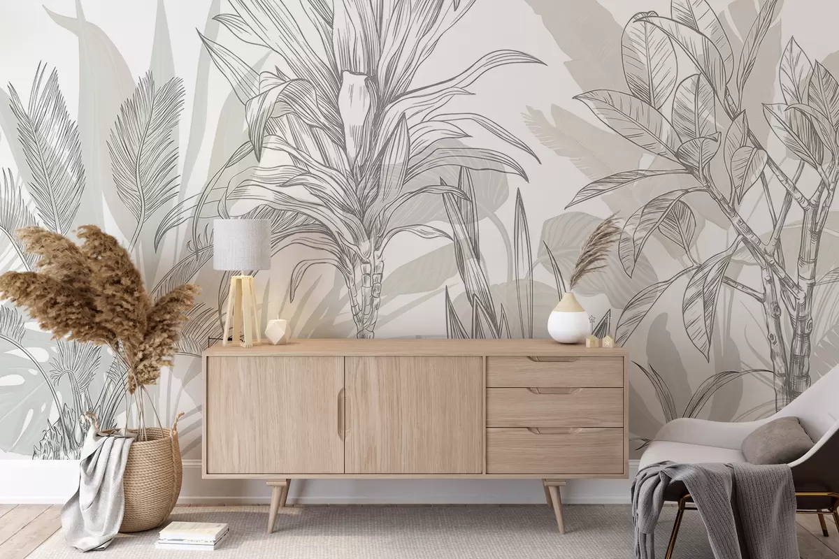 Fototapety Tropické grafické rastliny s veľkými, sviežimi listami a kvetmi v odtieňoch sivej a bielej farby s kvetinovými zelenými siluetami Nr. w08327