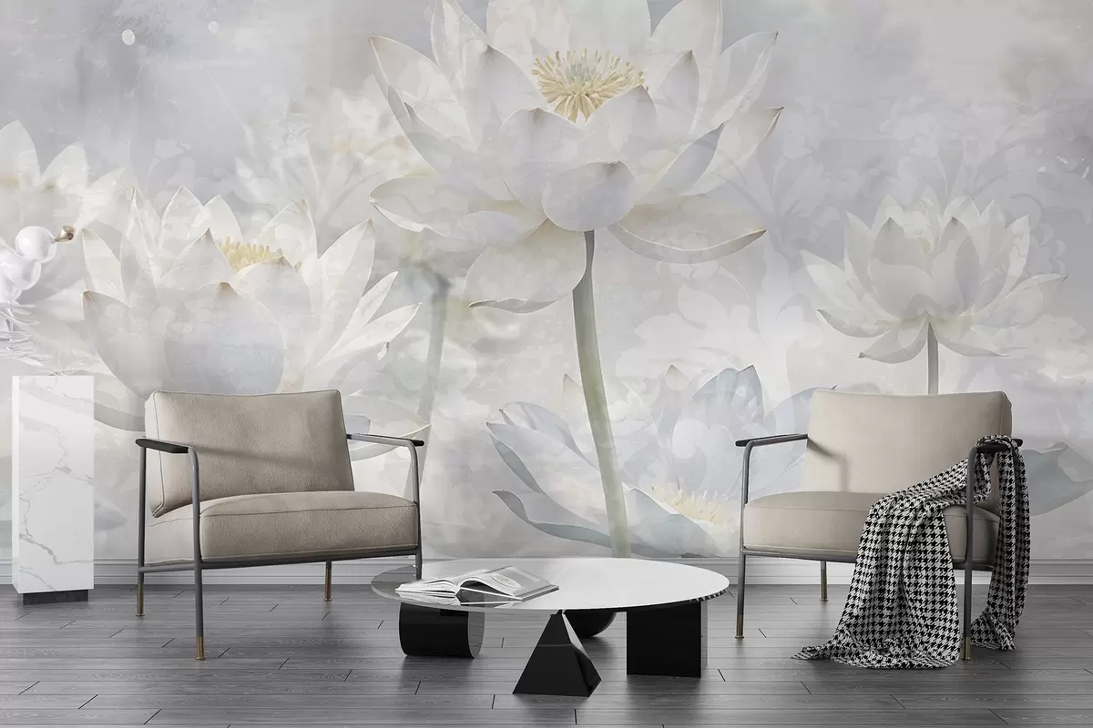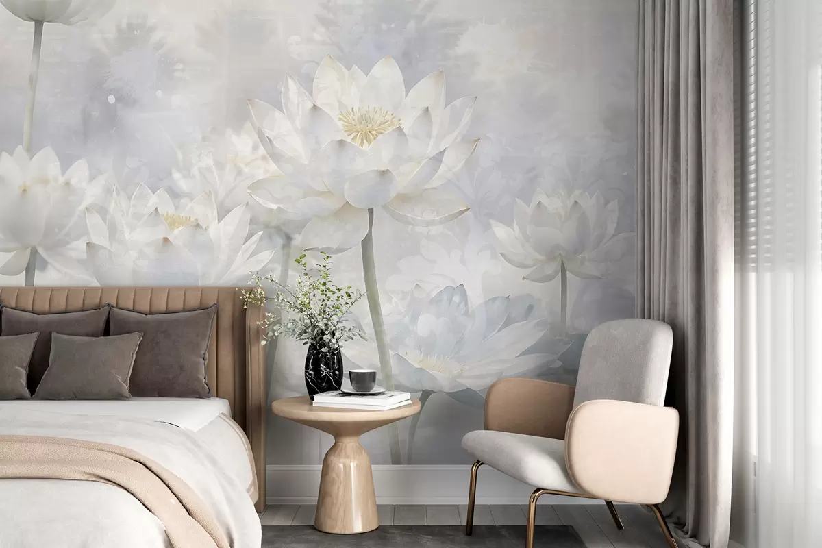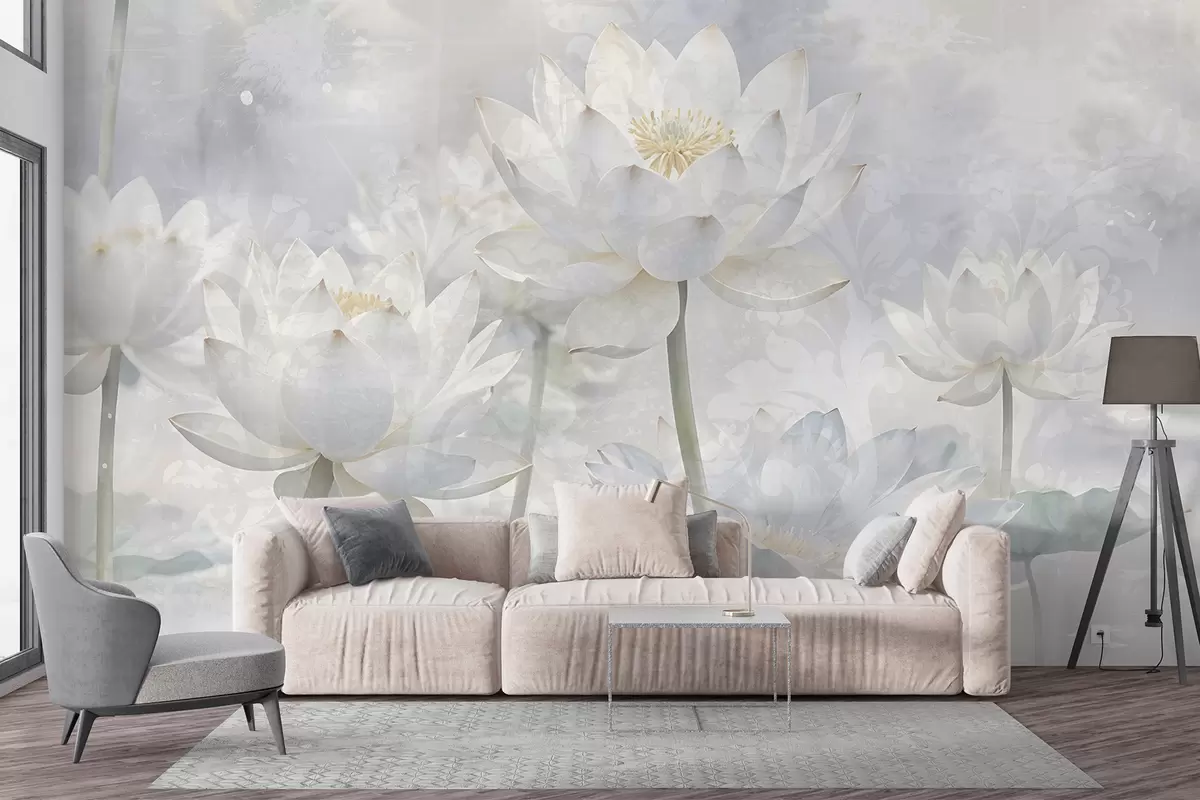 Fototapety Biele lotosové kvety v hmlistom, éterickom pozadí abstraktnej pastelovej krajiny Nr. w08328