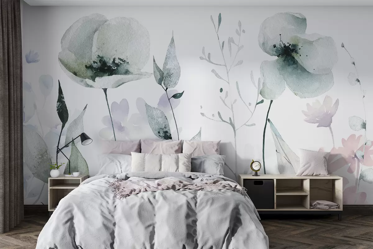 Fototapety Pastelové akvarelové kvety s jemnými okvetnými lístkami a listami v odtieňoch sivej, bielej a svetloružovej na bielom pozadí Nr. w08332