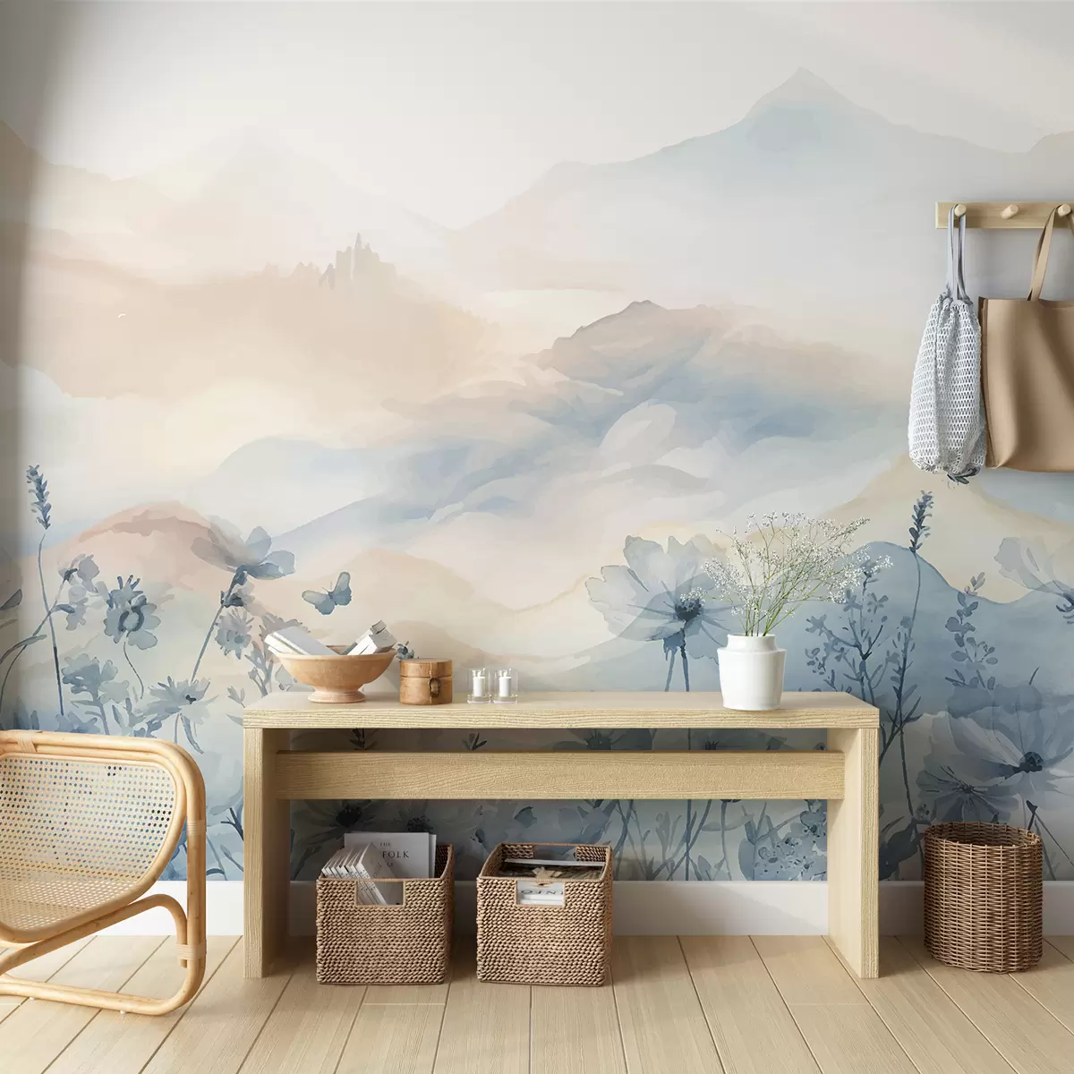 Fototapety Pokojná krajina s hmlistým pohorím v pozadí, obklopená poľom jemných modrých kvetov Nr. w08339