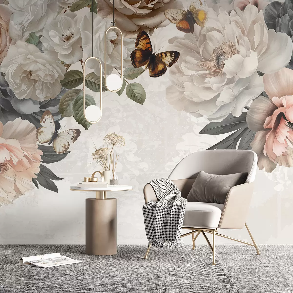 Fototapety Veľké biele a ružové kvety pivónie s motýľom sediacim na jednom z kvetov na jemnom, rozmazanom pozadí Nr. w08340