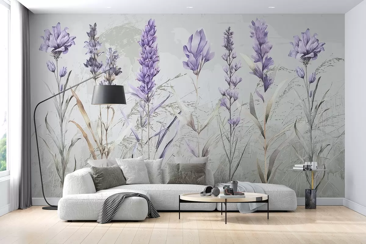 Fototapety Pole fialových akvarelových levanduľových kvetov s jemným, rozmazaným béžovým pozadím Nr. w08346