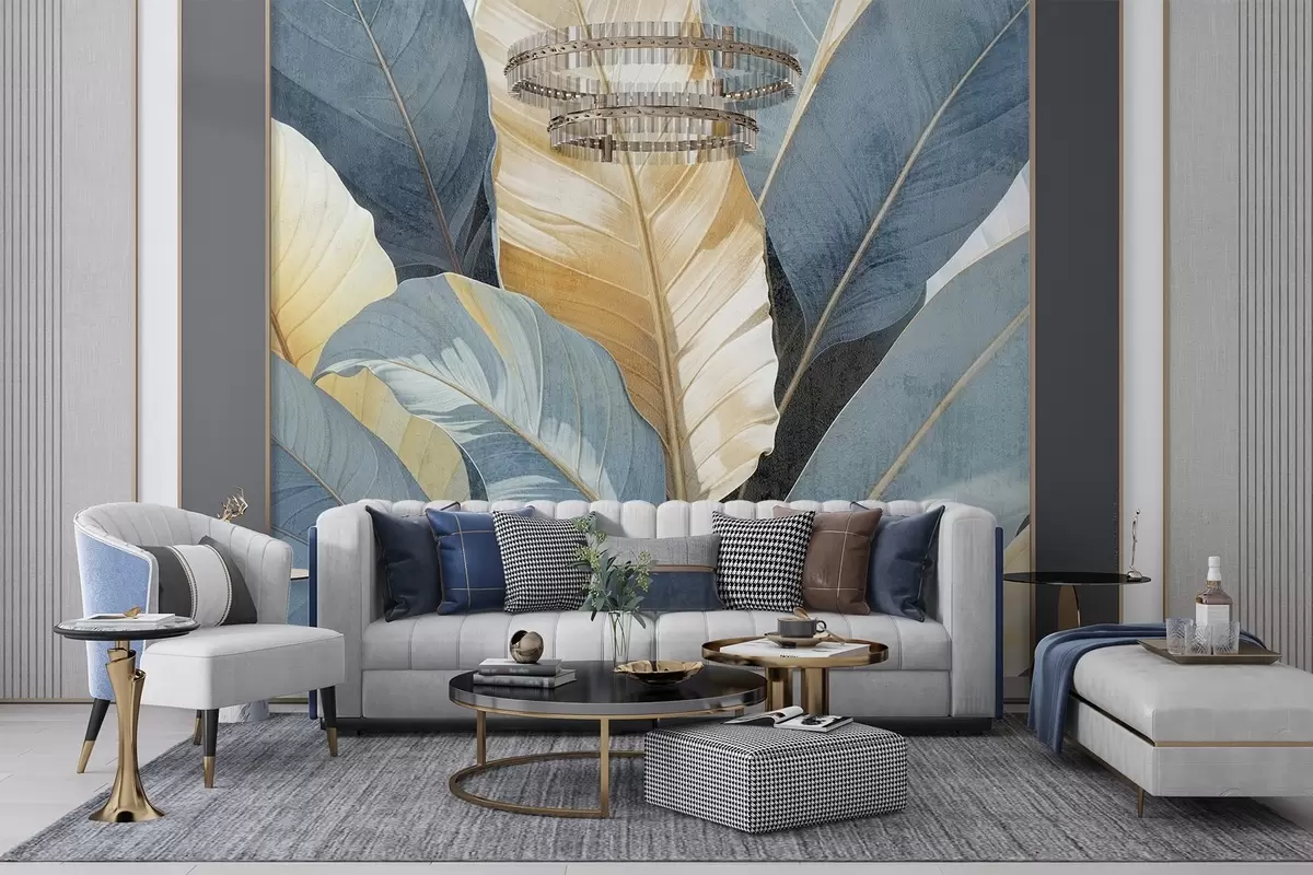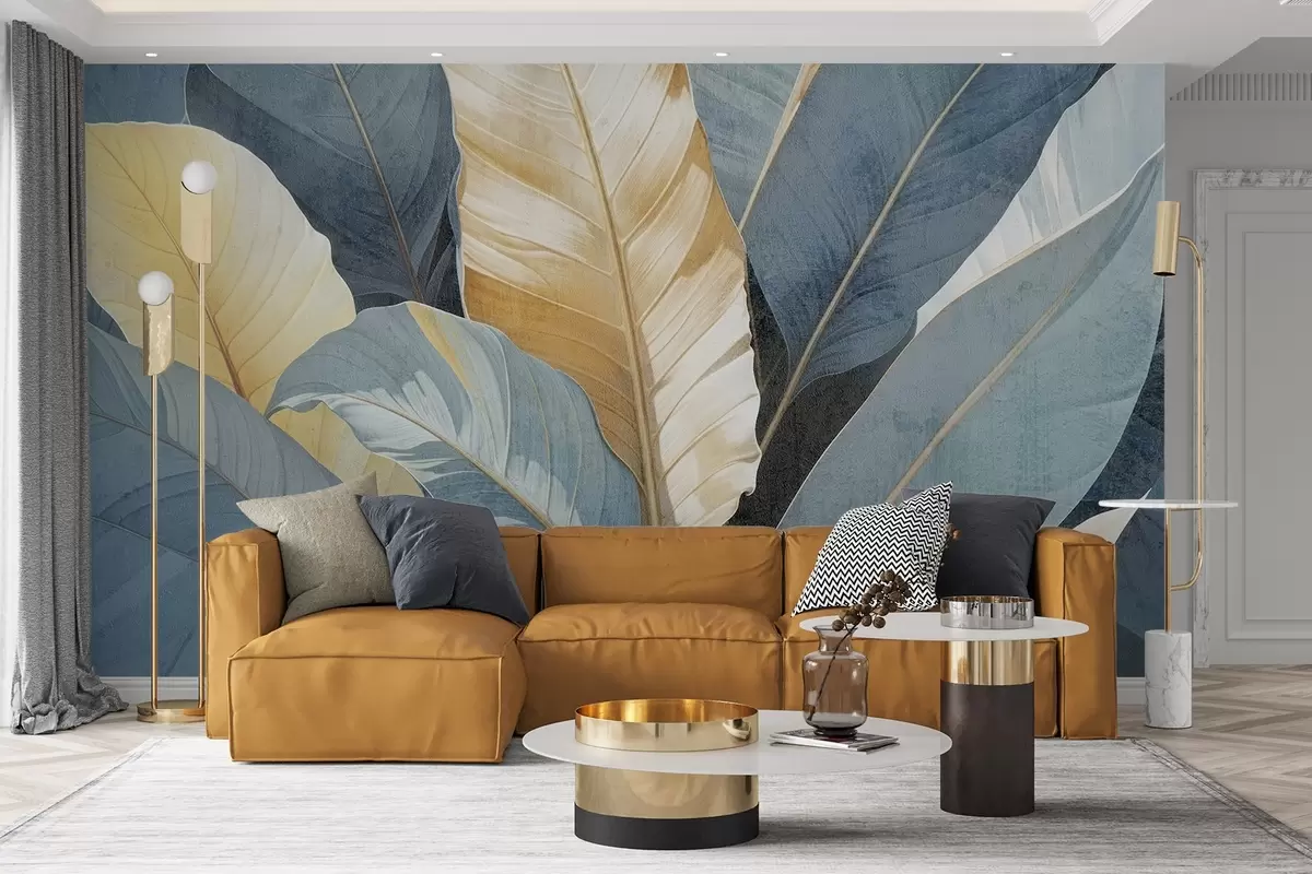 Fototapety Pohľad zblízka na veľké svieže, štruktúrované dekoratívne tropické listy v modrých, zelených a žltých odtieňoch Nr. w08373