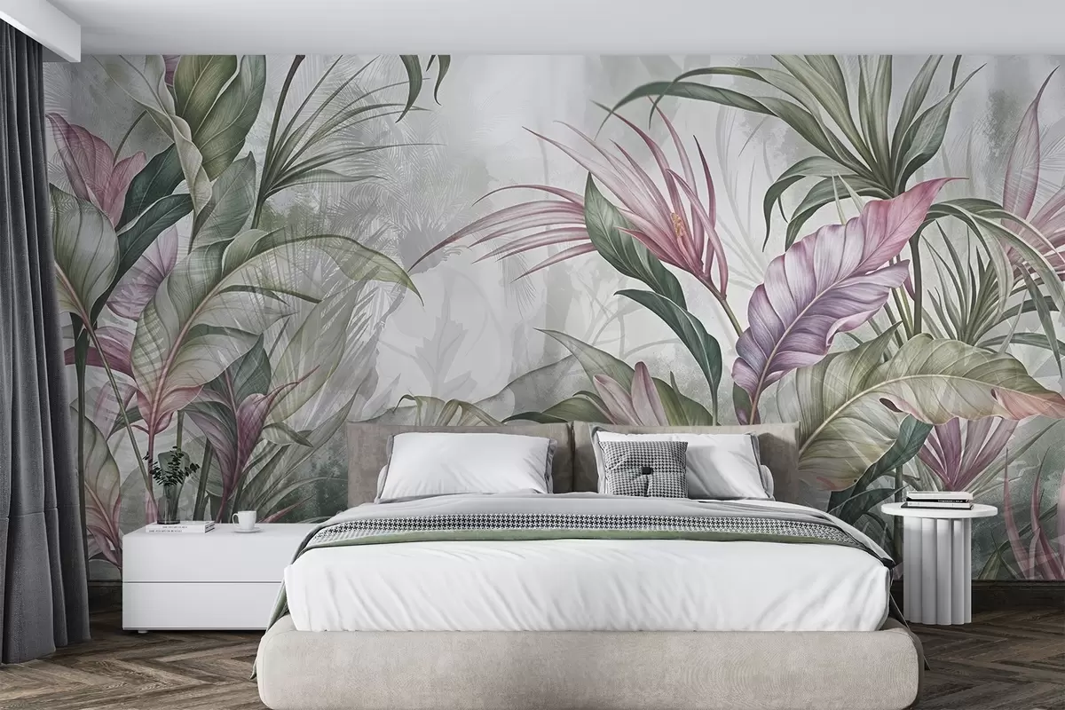 Fototapety Tropická džungľa s veľkými zelenými listami a ružovými kvetmi protey s rozmazaným textúrovaným pozadím Nr. w08375