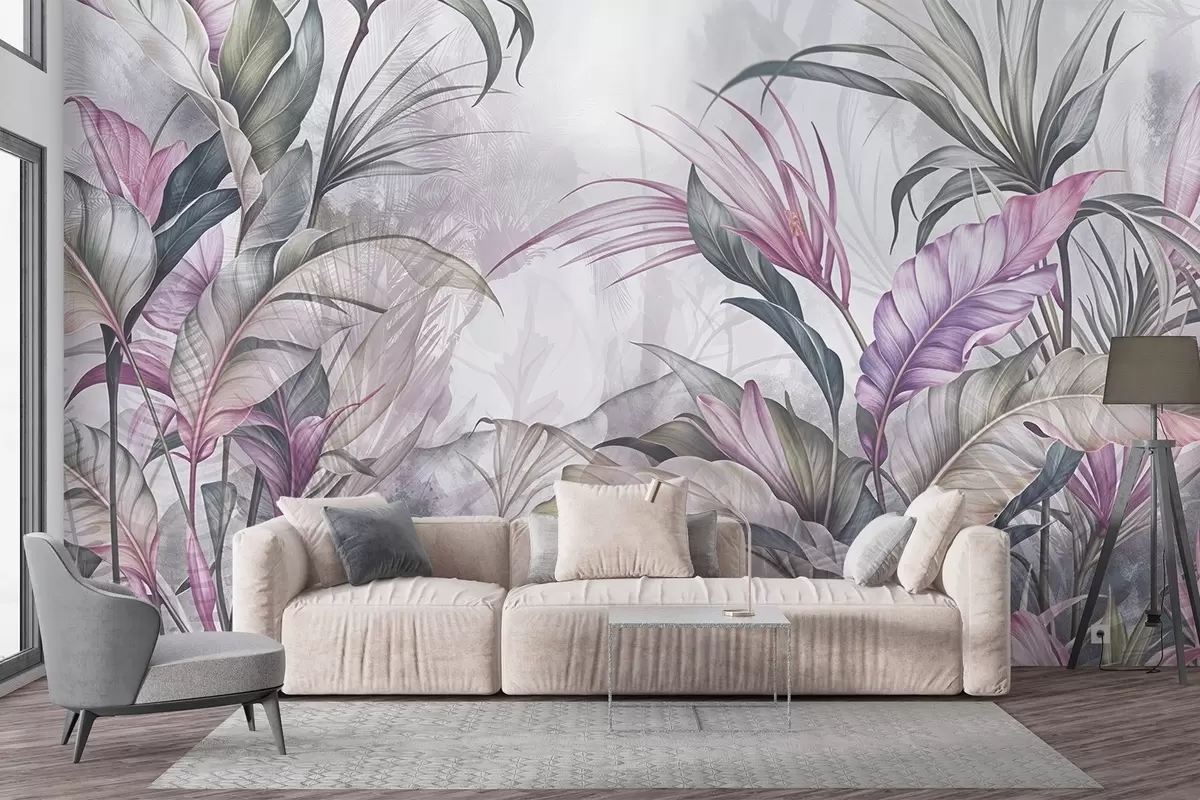Fototapety Tropická džungľa s veľkými zelenými listami a ružovými kvetmi protey s rozmazaným textúrovaným pozadím Nr. w08375v1