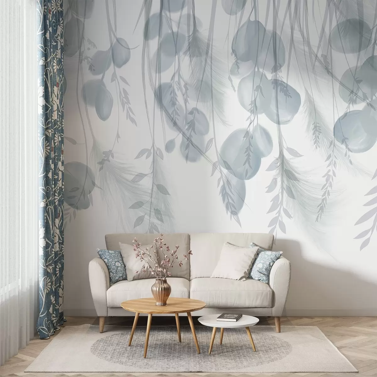 Fototapety Jemné sivé a pastelovo zelené listy eukalyptu, ktoré padajú a vytvárajú pokojnú a upokojujúcu atmosféru Nr. w08380