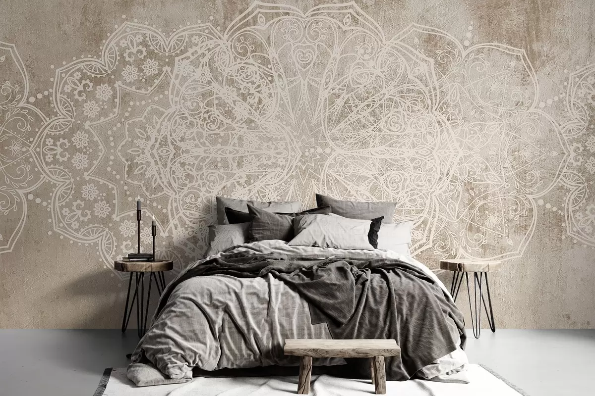 Fototapety Detailný, zložitý vzor bielej čipky mandala na béžovo-hnedom pozadí steny s textúrou loftu Nr. w08387v1
