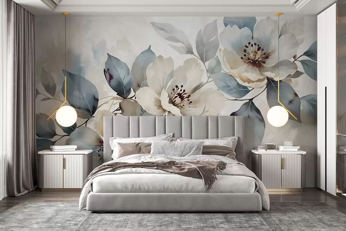 Fototapety Jemné akvarelové textúrované biele a modré kvetinové aranžmá s mäkkými okvetnými lístkami a stredmi Nr. w08401