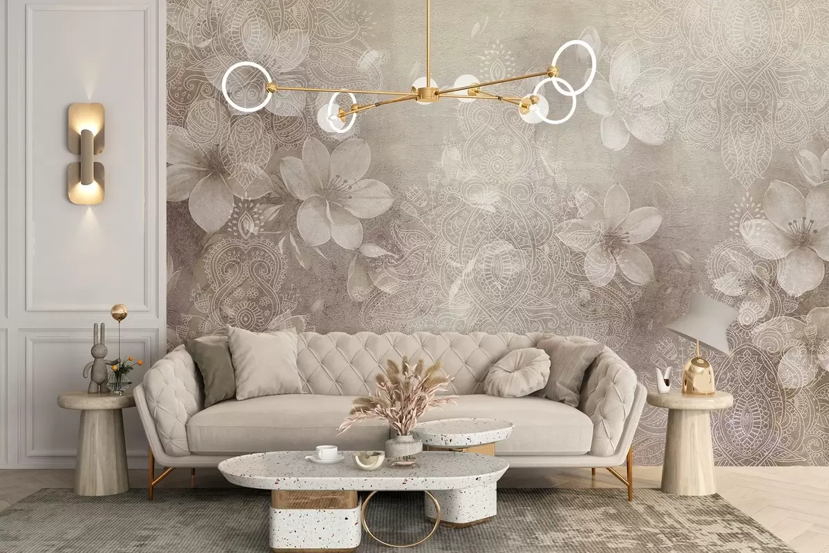 Fototapety Mäkká kresba jemných bielych kvetov na rozmazanom béžovom pozadí s textúrou čipky Nr. w08405v1