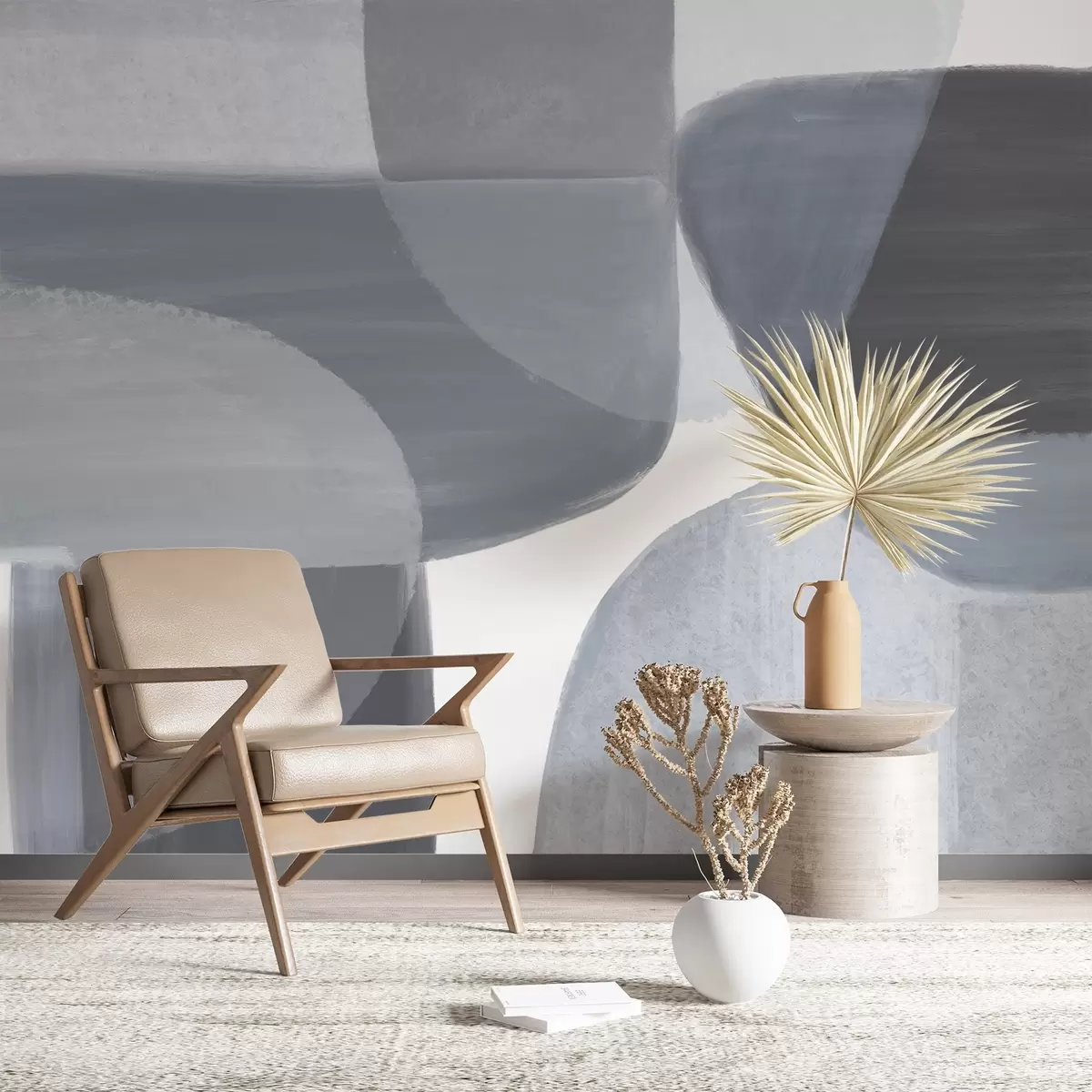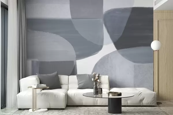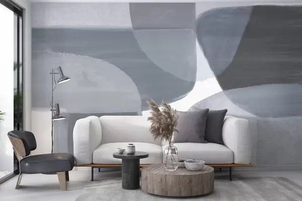 Fototapety Monochromatická abstraktná tlač s prekrývajúcimi sa minimalistickými tvarmi a formami v odtieňoch sivej a modrej farby Nr. w08410