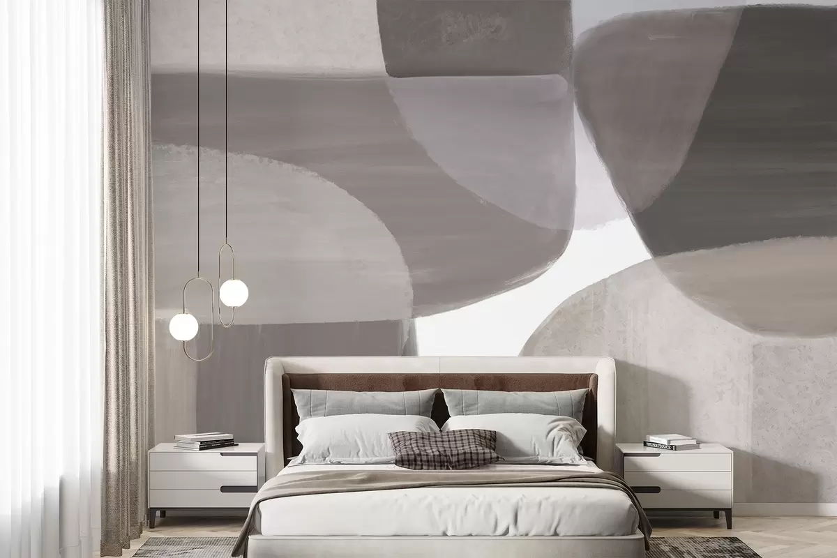 Fototapety Monochromatická abstraktná potlač s prekrývajúcimi sa minimalistickými tvarmi a formami v odtieňoch sivej a béžovej farby Nr. w08410v1