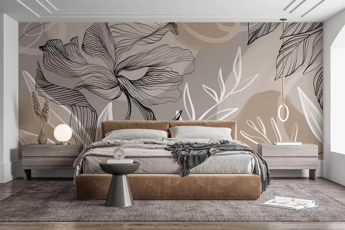 Fototapety Elegantná kvetinová potlač s veľkými abstraktnými líniami kvetov a listov v odtieňoch sivej a béžovej na svetlom pozadí Nr. w08413