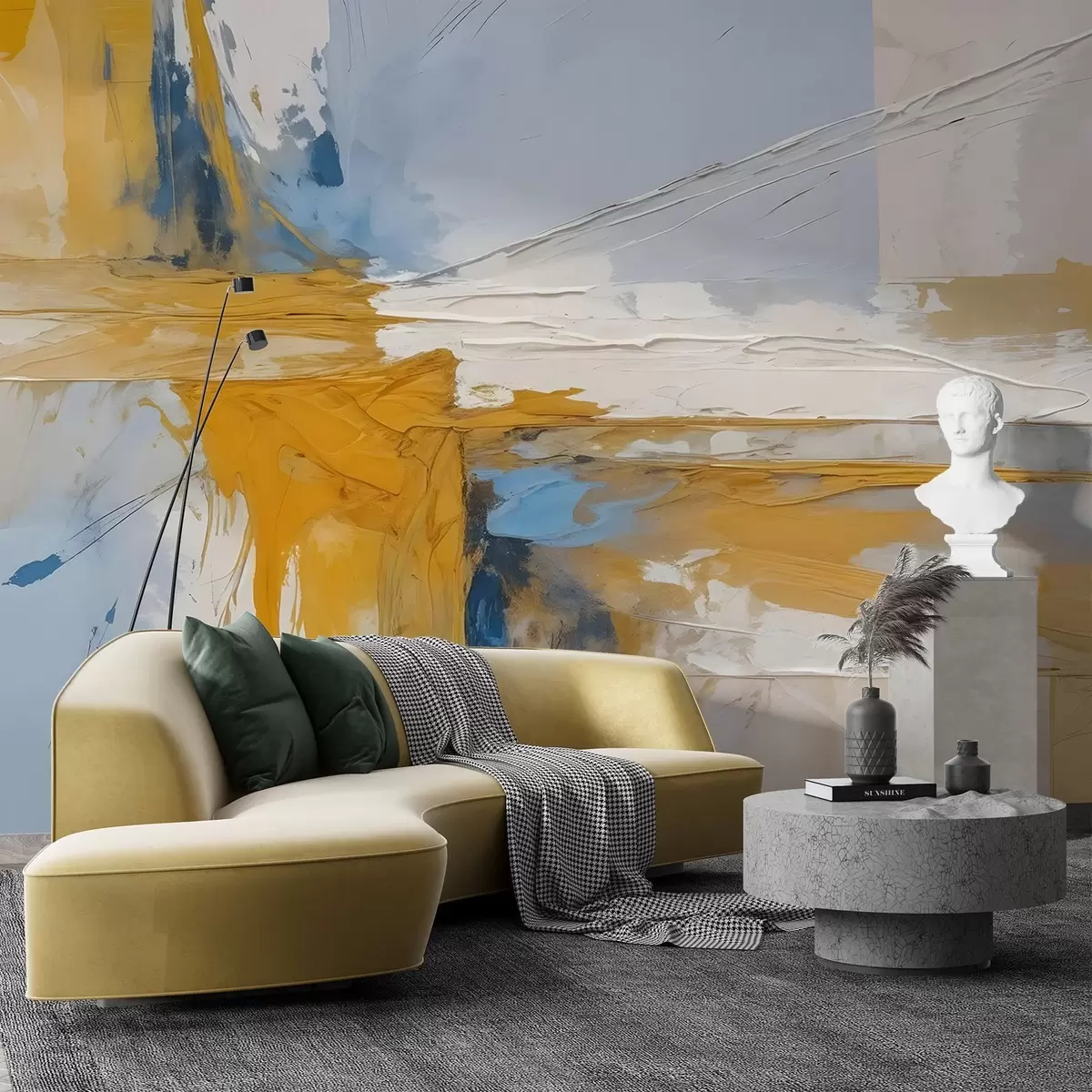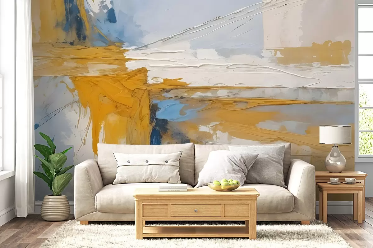 Fototapety Minimalistická abstraktná umelecká kompozícia s odvážnymi ťahmi štetcom v žltej, modrej a bielej farbe Nr. w08414