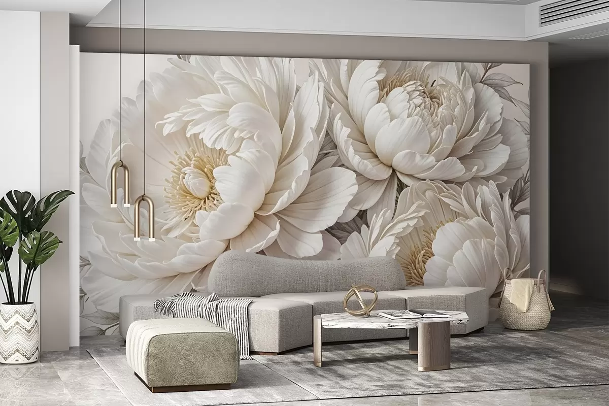 Fototapety Jemné pastelové biele pivonky so sviežimi listami na jemnom neutrálnom pozadí Nr. w08420