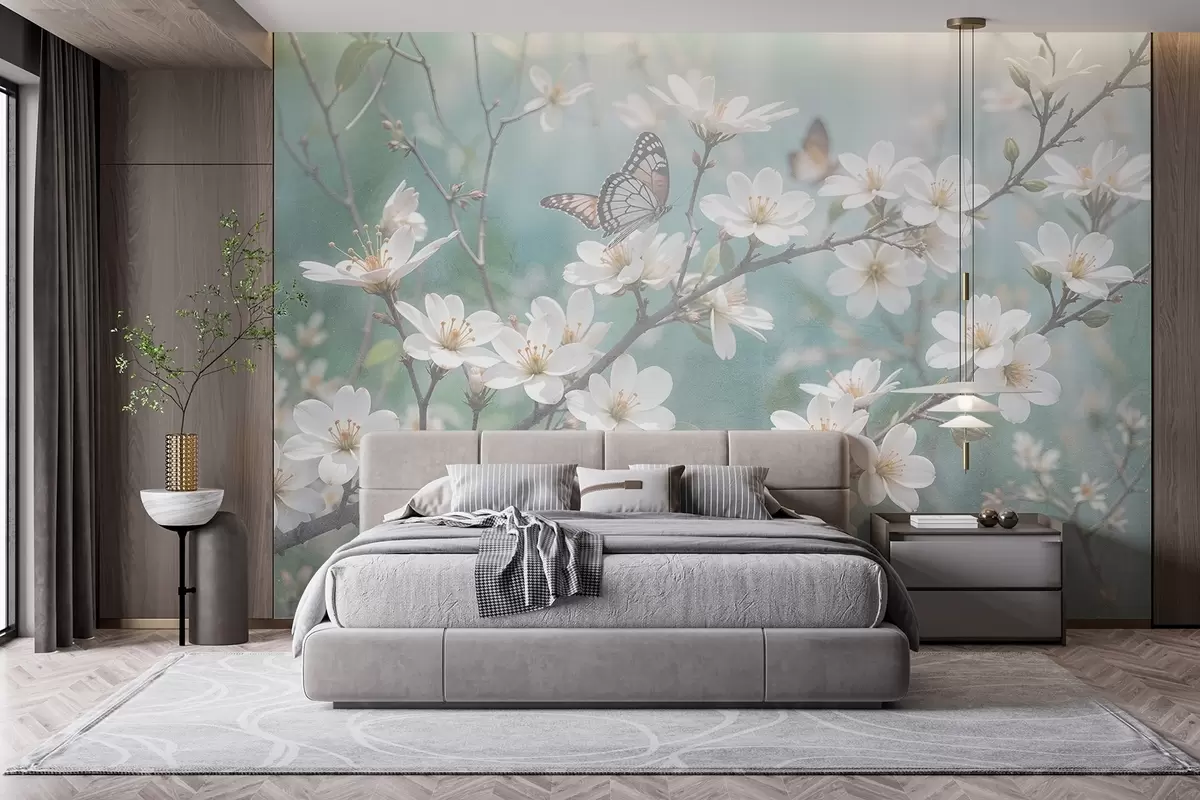 Fototapety Biely motýľ na konári s jemnými bielymi čerešňovými kvetmi v popredí na rozmazanom pozadí Nr. w08421
