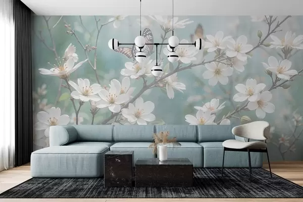 Fototapety Biely motýľ na konári s jemnými bielymi čerešňovými kvetmi v popredí na rozmazanom pozadí Nr. w08421