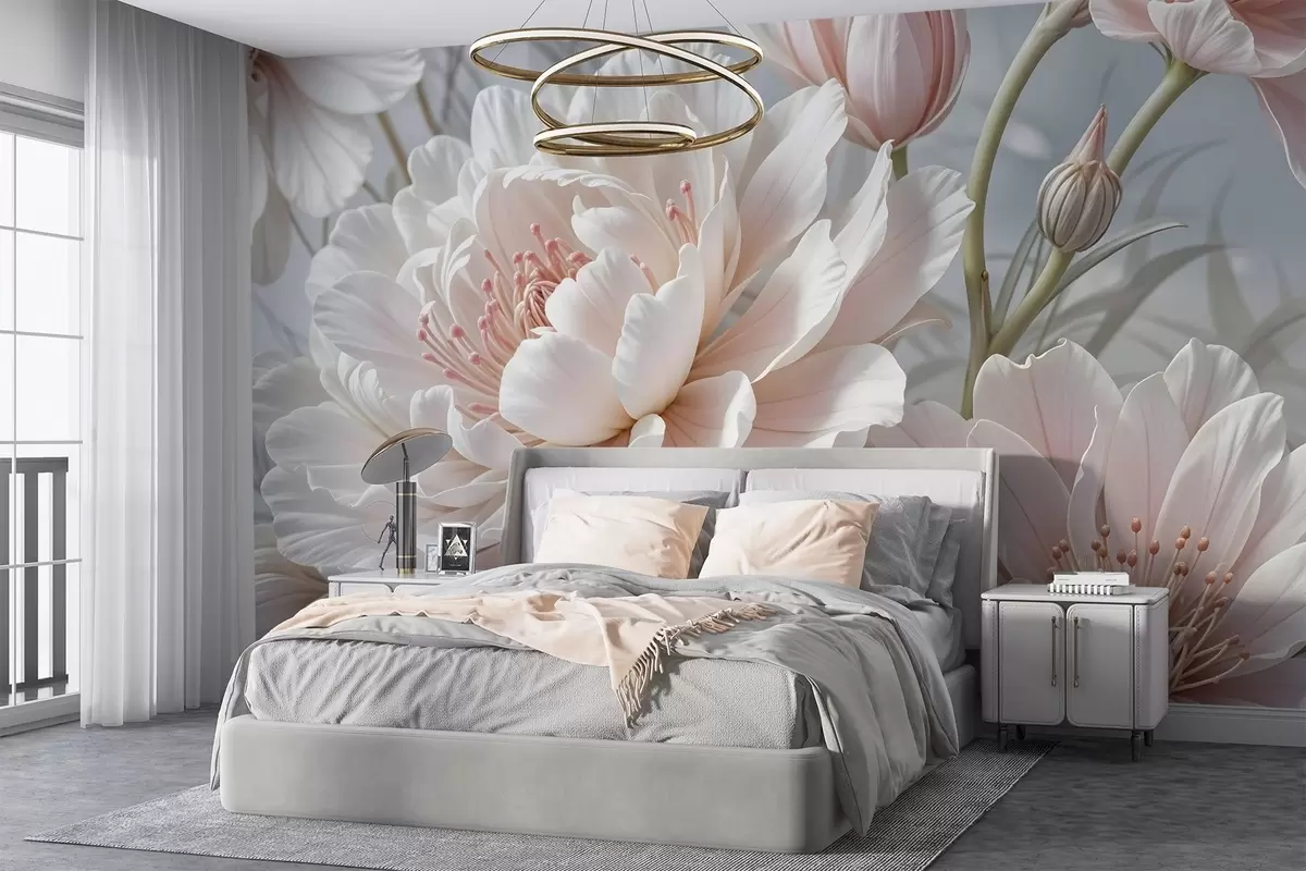 Fototapety Veľké, jemné biele a ružové kvety pivónie s mäkkými, nadýchanými okvetnými lístkami na rozmazanom sivom pozadí Nr. w08427