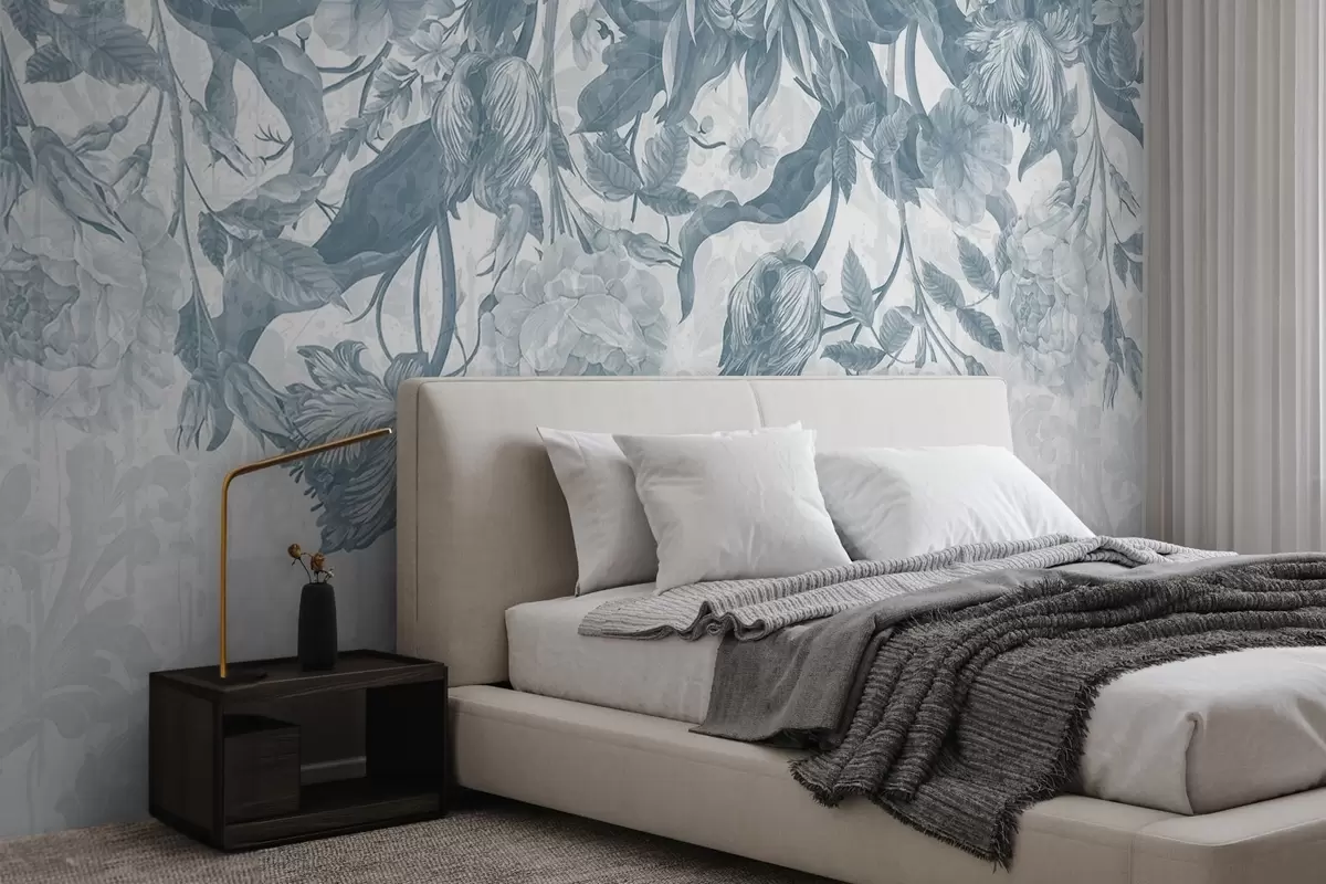Fototapety Svieža kvetinová výzdoba s veľkými modrými a bielymi kvetmi s pastelovo modrými listami a stonkami Nr. w08435v1