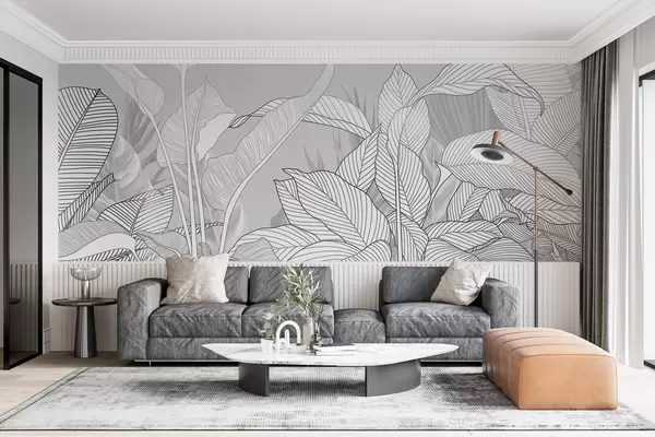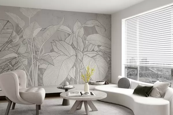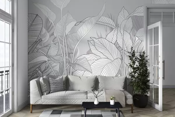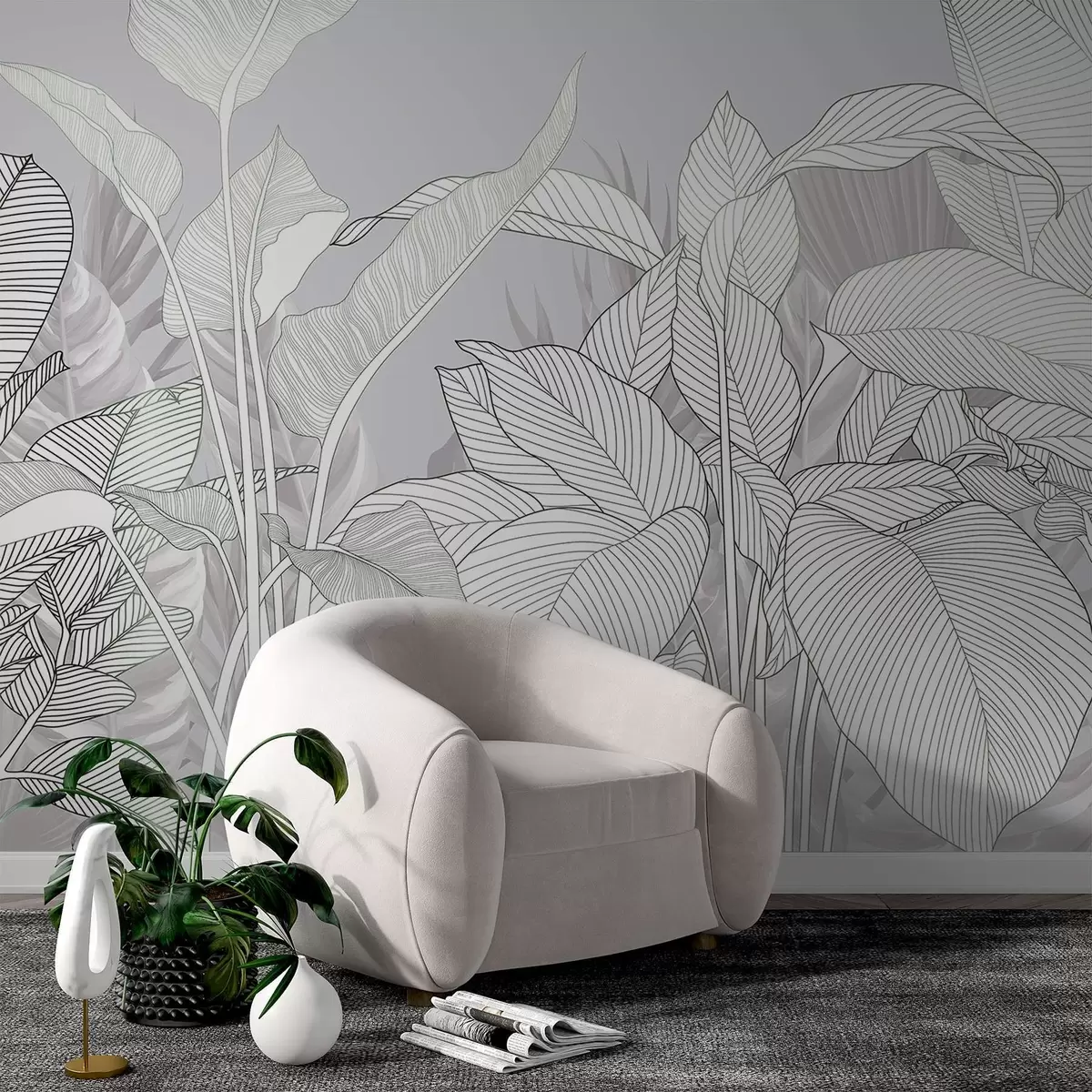 Fototapety Jednofarebná ilustrácia s veľkými štylizovanými listami a lístím so zložitými vzormi čiar a textúr Nr. w08436