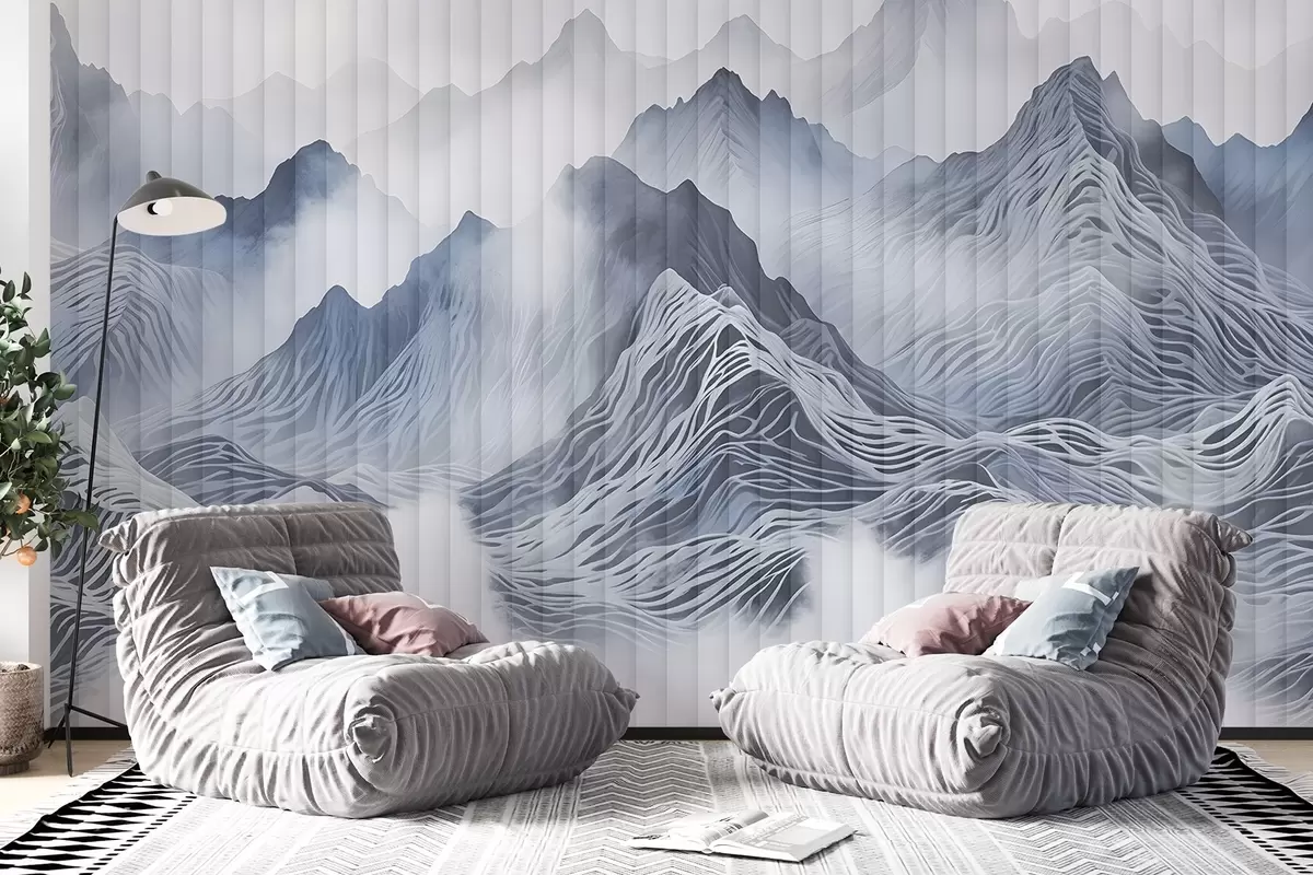 Fototapety Hmlistá abstraktná horská krajina s kopcami a vrcholmi v odtieňoch sivej a bielej Nr. w08440