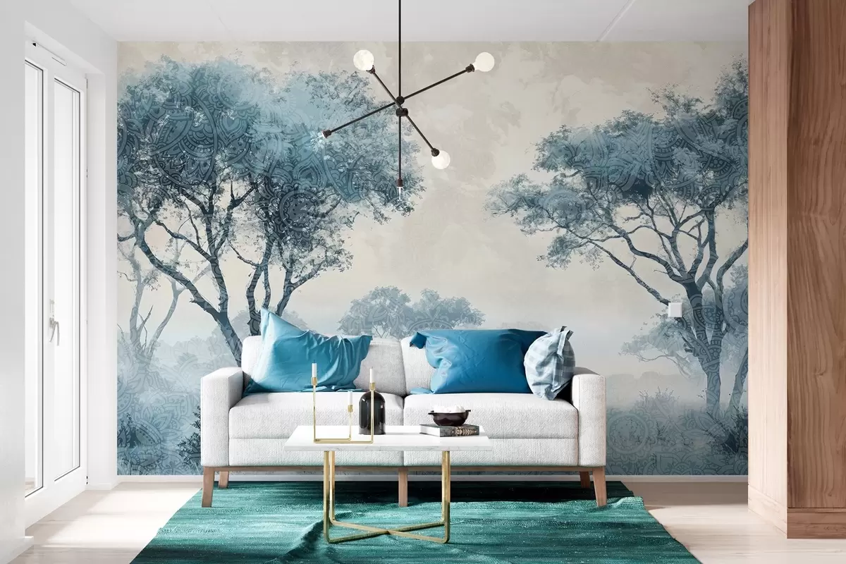 Fototapety Hmlistá, pokojná krajina so siluetami stromov v popredí s jemnou hmlou v modrých a béžových odtieňoch Nr. w08442