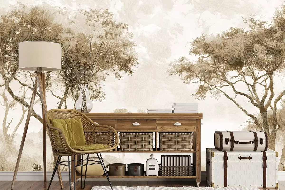 Fototapety Hmlistá, pokojná krajina so siluetami stromov v popredí s jemnou hmlou v odtieňoch hnedej a béžovej Nr. w08442v2
