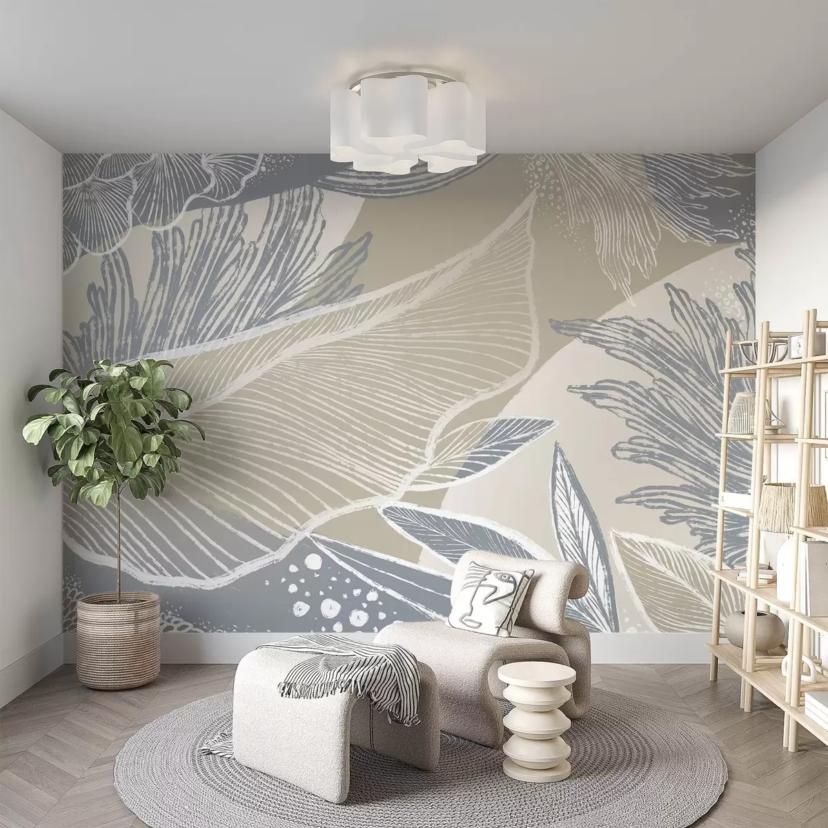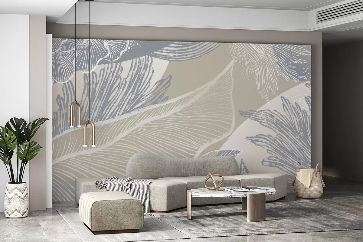 Fototapety Pastelovo modrá a biela abstraktná tlač s organickými tvarmi a líniami s tlmenou farebnou paletou Nr. w08450