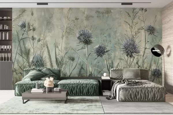 Fototapety Pole fialových kvetov bodliaka s rozmazanými kvetmi a listami na pozadí s vintage textúrou Nr. w08463