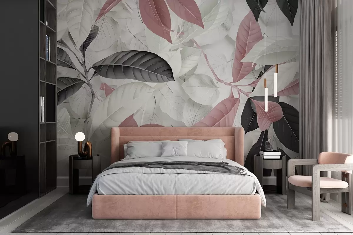 Fototapety Veľká potlač ružových a sivých listov na pozadí s textúrou svetlých listov, ktorá vytvára svieži tropický dojem Nr. w08468