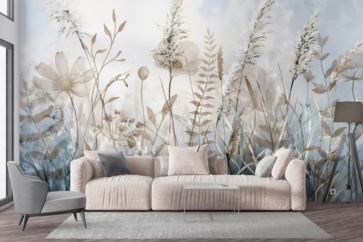 Fototapety Pole s vysokou trávou, prírodným lístím a rastlinami s jemnou, mútnou štruktúrou na pozadí hmlistej, zamračenej oblohy Nr. w08472