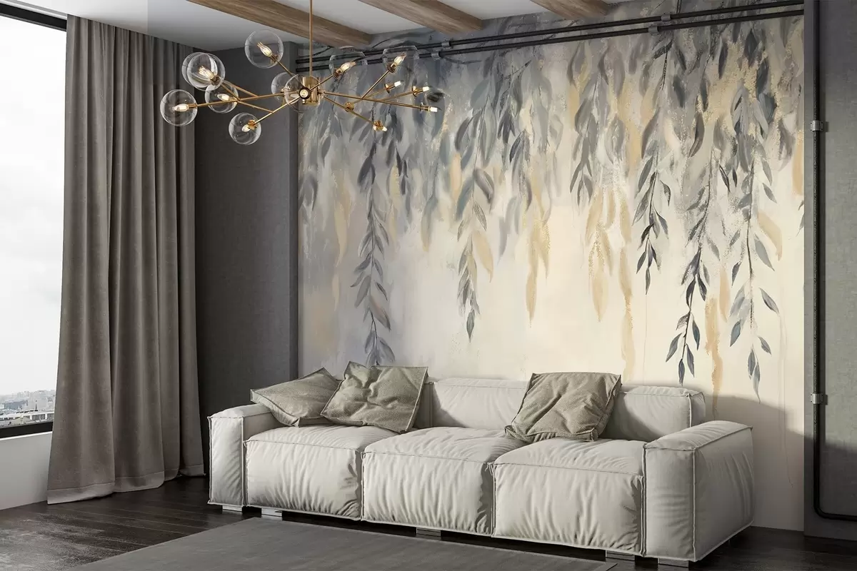 Fototapety Vŕbové konáre s jemnými listami visiacimi dole na jemnom, rozmazanom textúrovanom pozadí Nr. w08473