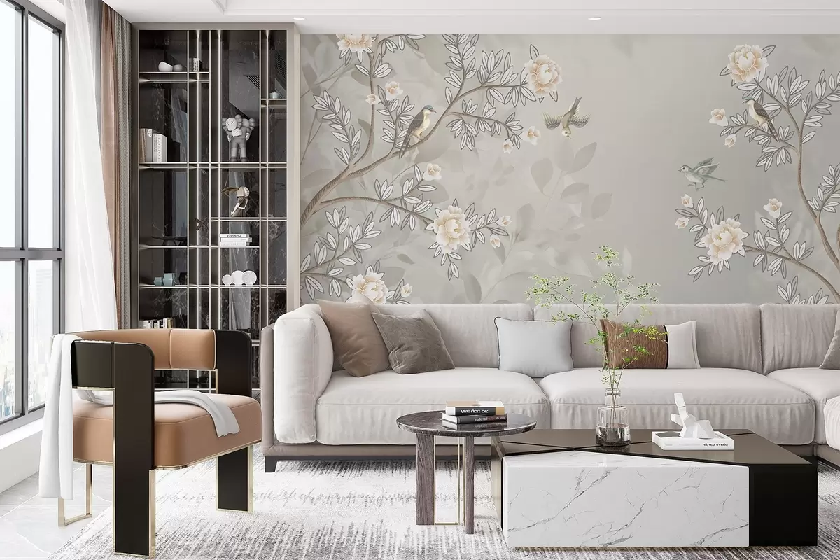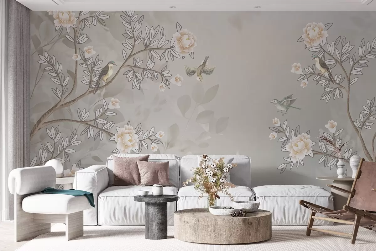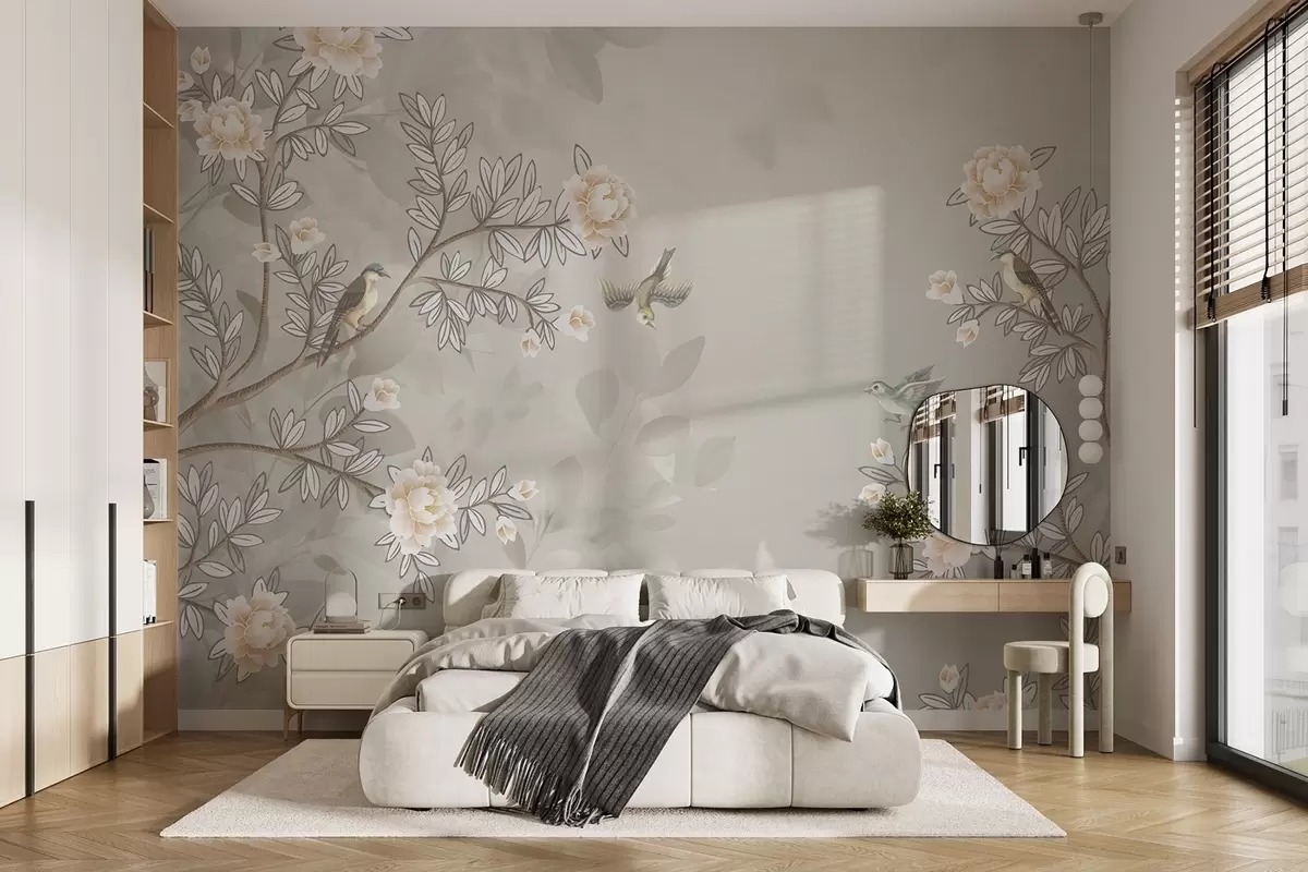 Fototapety Vetvy s ružami a lietajúcimi vtákmi vo svetlých tónoch Nr. w08493