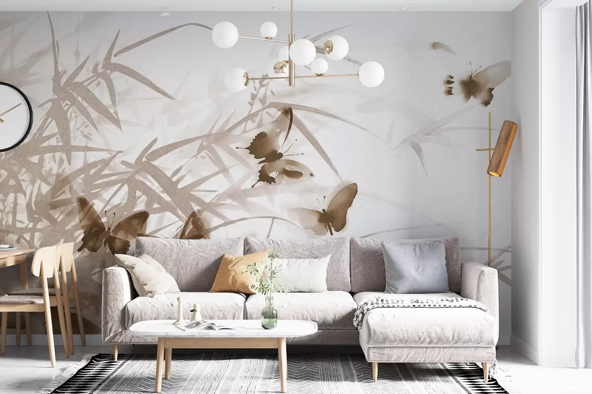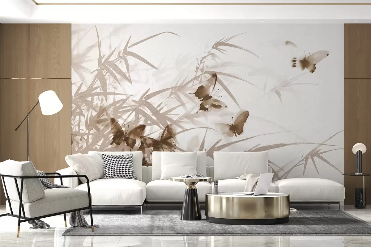 Fototapety Texturálne bambusové listy a stonky s lietajúcimi hnedými motýľmi s priehľadnými krídlami Nr. w08524v1