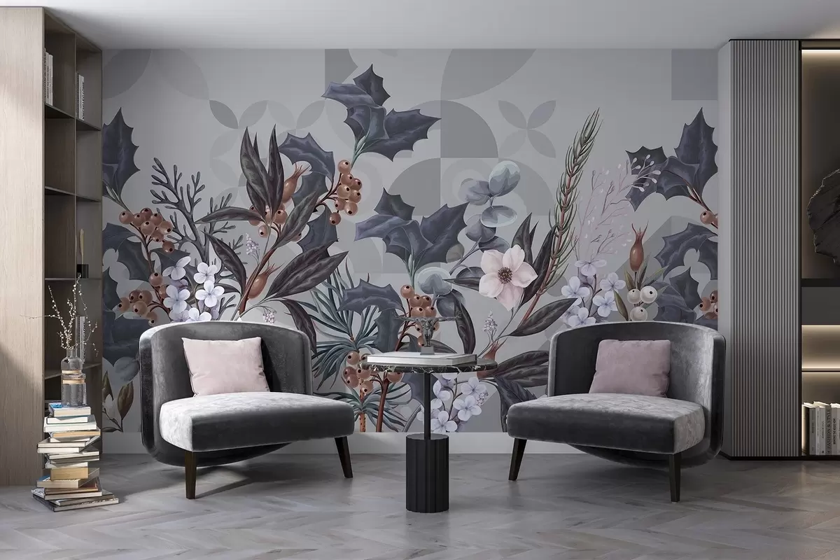 Fototapety Kvetinové aranžmá s veľkými tmavými listami, kvetmi a bobuľami na tlmenom sivom geometrickom abstraktnom pozadí Nr. w08525