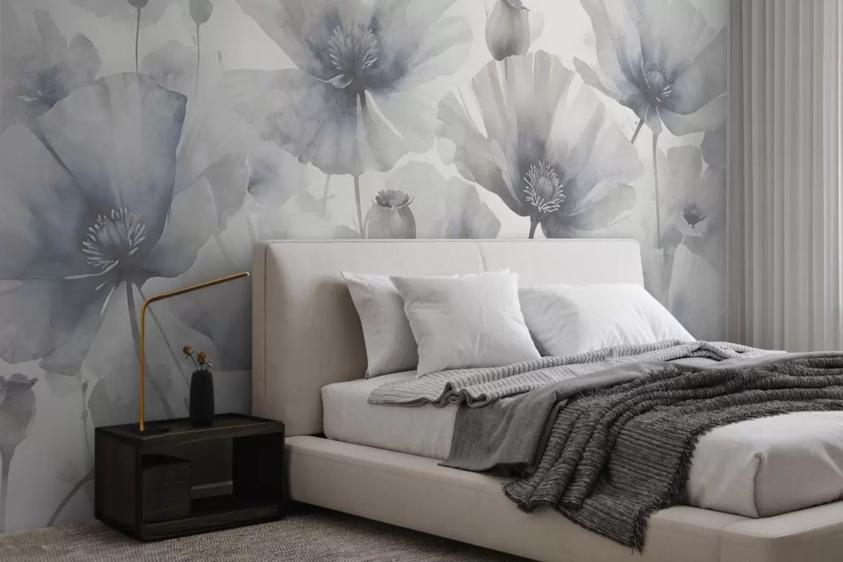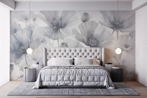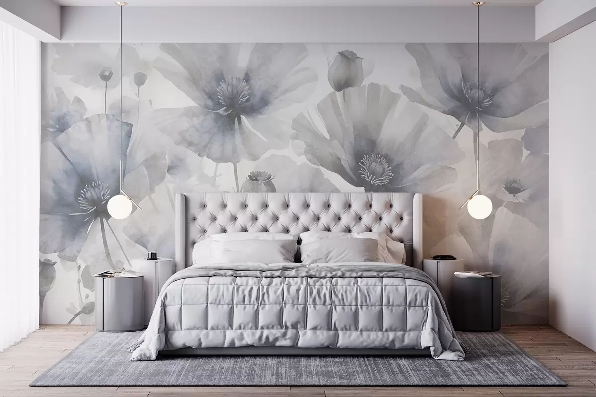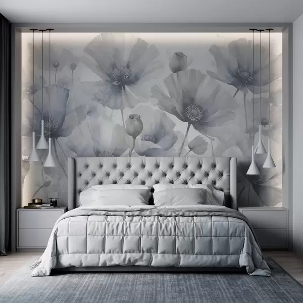 Fototapety Jemné texturálne grunge sivé a biele kvety s jemnými, rozmazanými okvetnými lístkami na bielom pozadí Nr. w08526