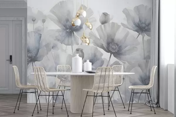 Fototapety Jemné texturálne grunge sivé a biele kvety s jemnými, rozmazanými okvetnými lístkami na bielom pozadí Nr. w08526