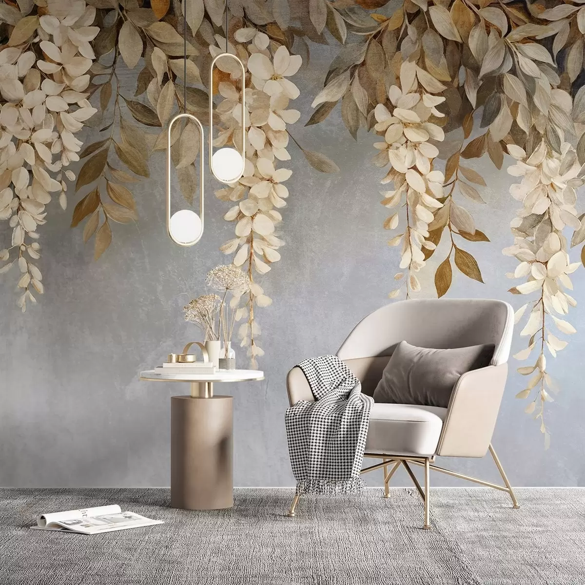 Fototapety Jemné biele a svetlo béžové kvety vistárie s kaskádovitými listami na jemnom sivom pozadí Nr. w08531