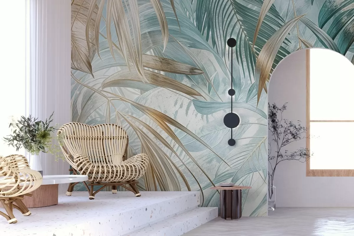 Fototapety Tropická abstraktná kvetinová potlač s veľkými palmovými listami v modrých a béžových odtieňoch vytvára sviežu atmosféru Nr. w08532