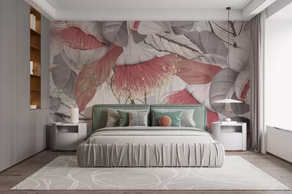 Fototapety Botanická ilustrácia veľkých eukaliptových kvetov s dlhými tyčinkami na sivom a bielom pozadí Nr. w08539