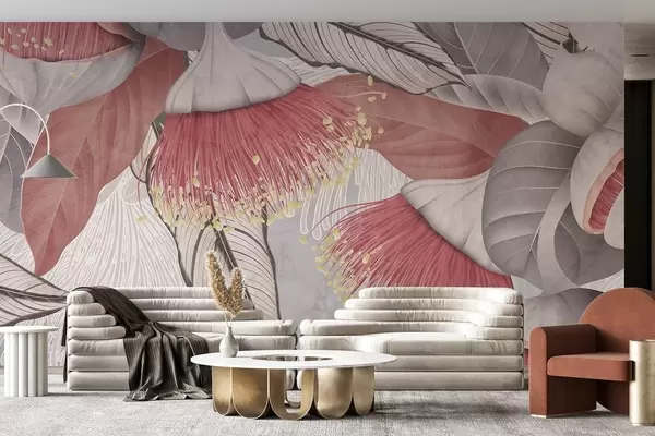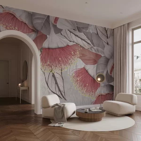 Fototapety Botanická ilustrácia veľkých eukaliptových kvetov s dlhými tyčinkami na sivom a bielom pozadí Nr. w08539