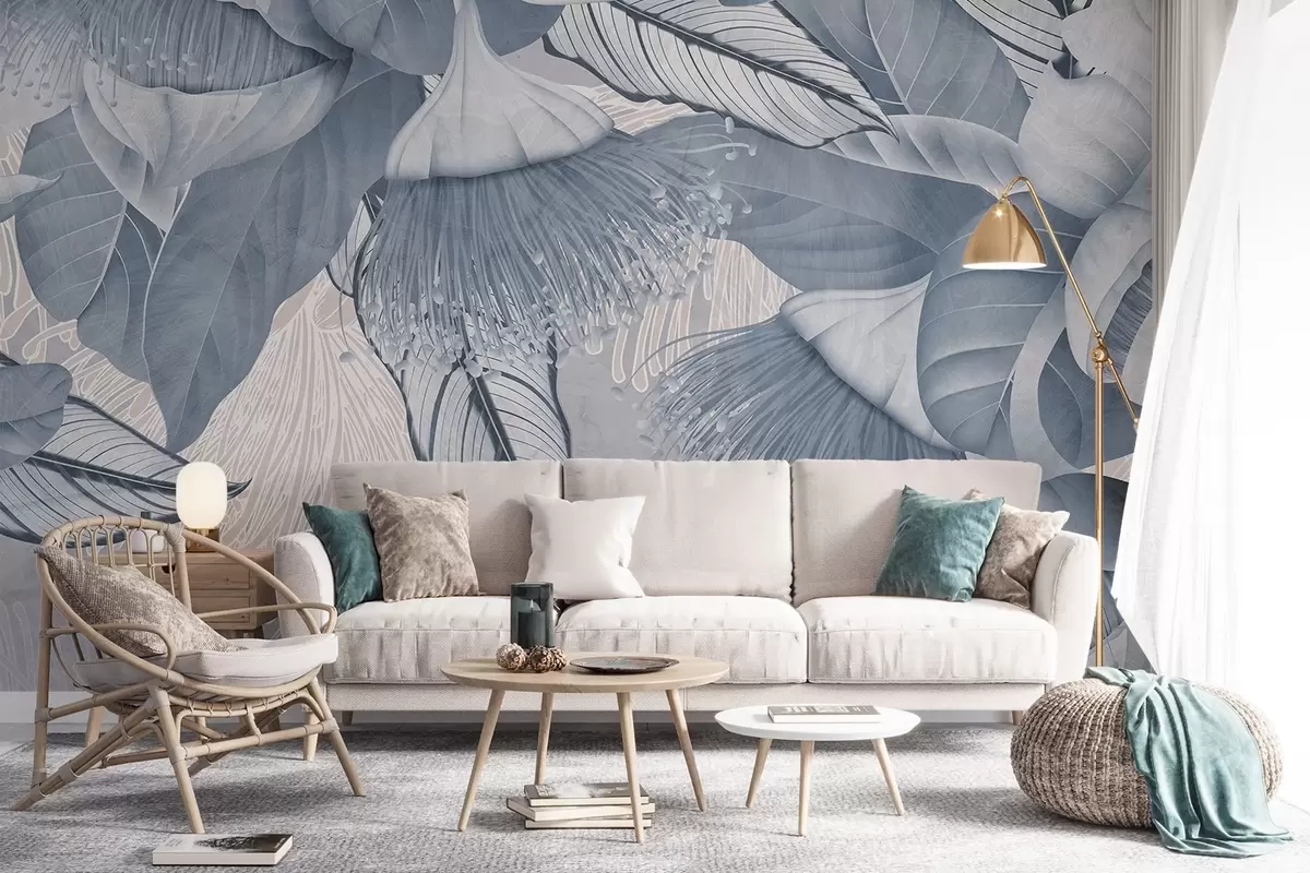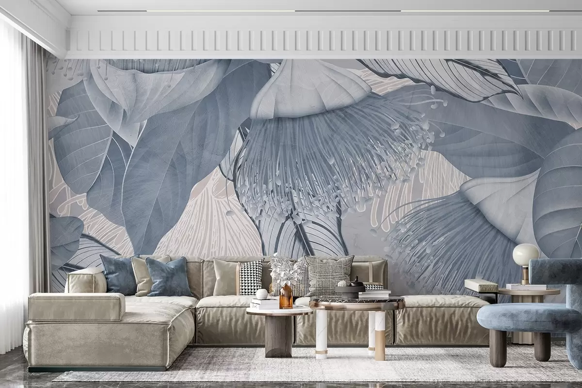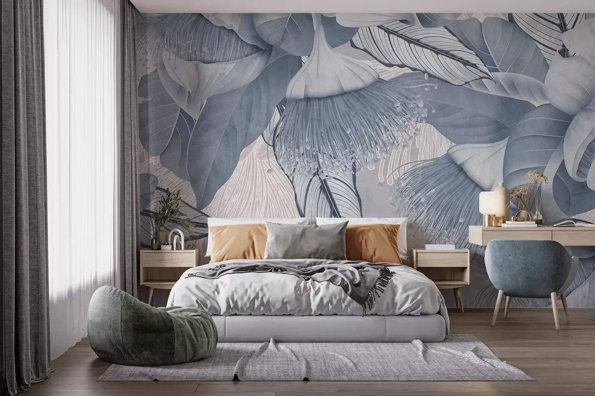 Fototapety Botanická ilustrácia veľkých modrých kvetov eukaliptu s dlhými tyčinkami na sivom a bielom pozadí Nr. w08539v1