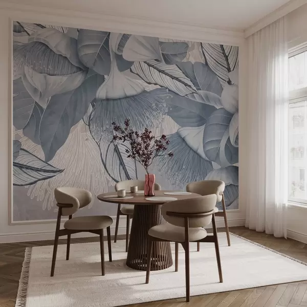 Fototapety Botanická ilustrácia veľkých modrých kvetov eukaliptu s dlhými tyčinkami na sivom a bielom pozadí Nr. w08539v1