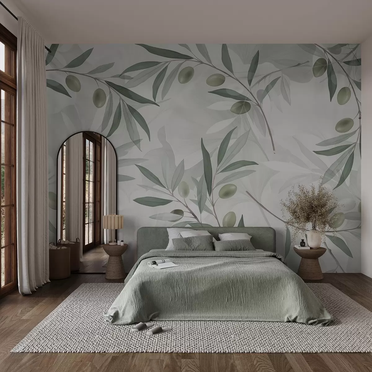 Fototapety Olivové vetvičky so zelenými listami a olivami na svetlom pozadí Nr. w08576
