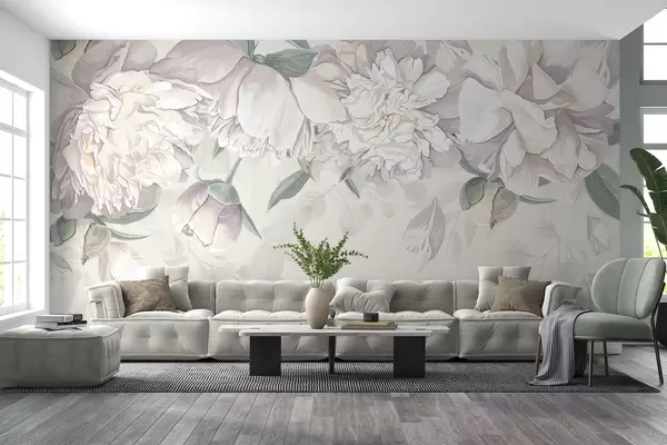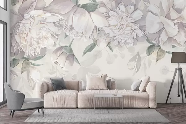 Fototapety Jemné biele a ružové pastelové pivonky so zelenými listami naaranžované v jemnom romantickom kvetinovom pozadí Nr. w08577